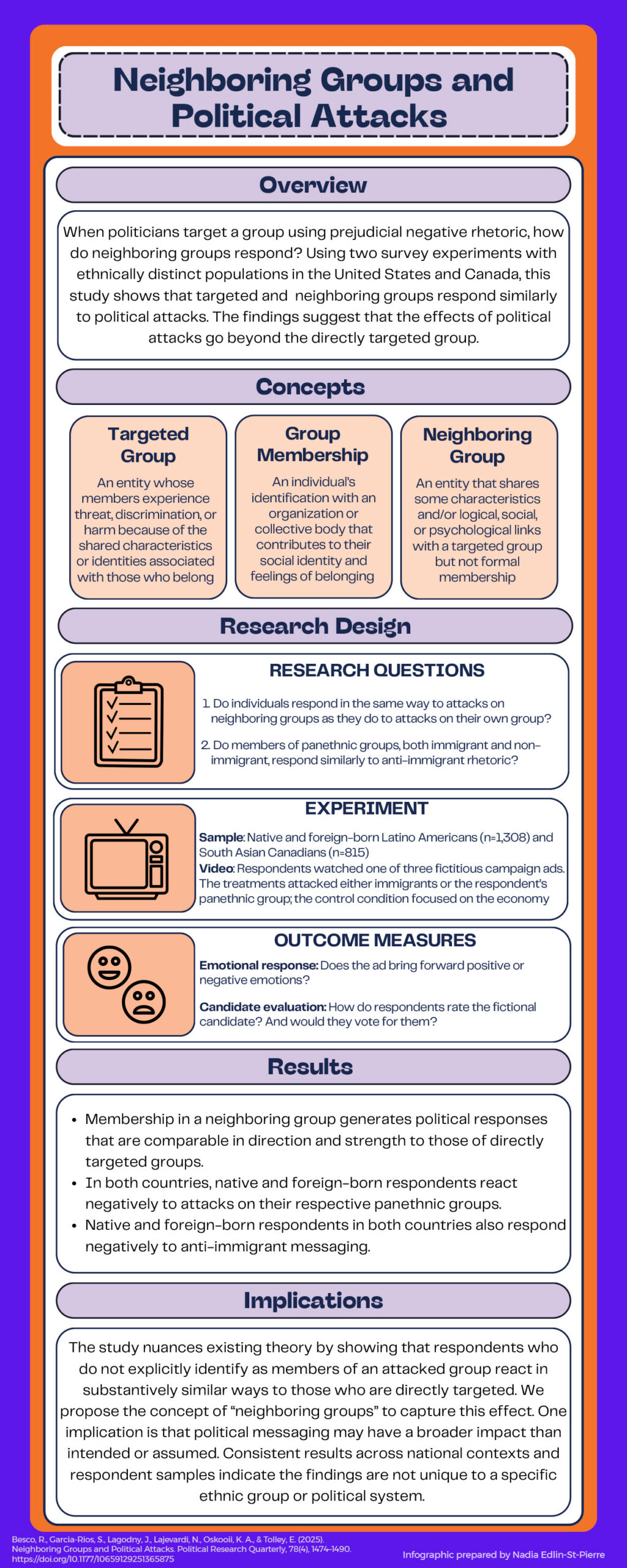 Explicit racism in political campaigns is rising, and some politicians now openly disparage immigrant, racial, and religious minorities. How do individuals respond to these attacks? Some research suggests people react more strongly to attacks on their own group, but what if the attack is directed toward a group that an individual does not belong to, but with which they share a logical, social, or psychological connection? We call these “neighboring” groups. Using survey experiments with immigrant and non-immigrant Latino Americans and South Asian Canadians, we measure the effect of exposure to campaign videos that disparage immigrants or Latinos/South Asians.